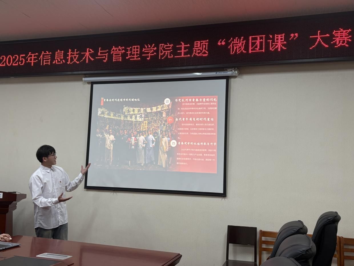 (本网讯)3月24日,信息技术与管理学院在办公楼315会议室举行2025年主题“微团课”大赛。比赛由学院团学会学生干部殷俊主持,学院党委副书记唐雄伟、学工办副主任陈慧、团总支书记李雨希、学生第一党支部书记周虎田、学生第二党支部书记周潇雨组成评委团全程参与评审。