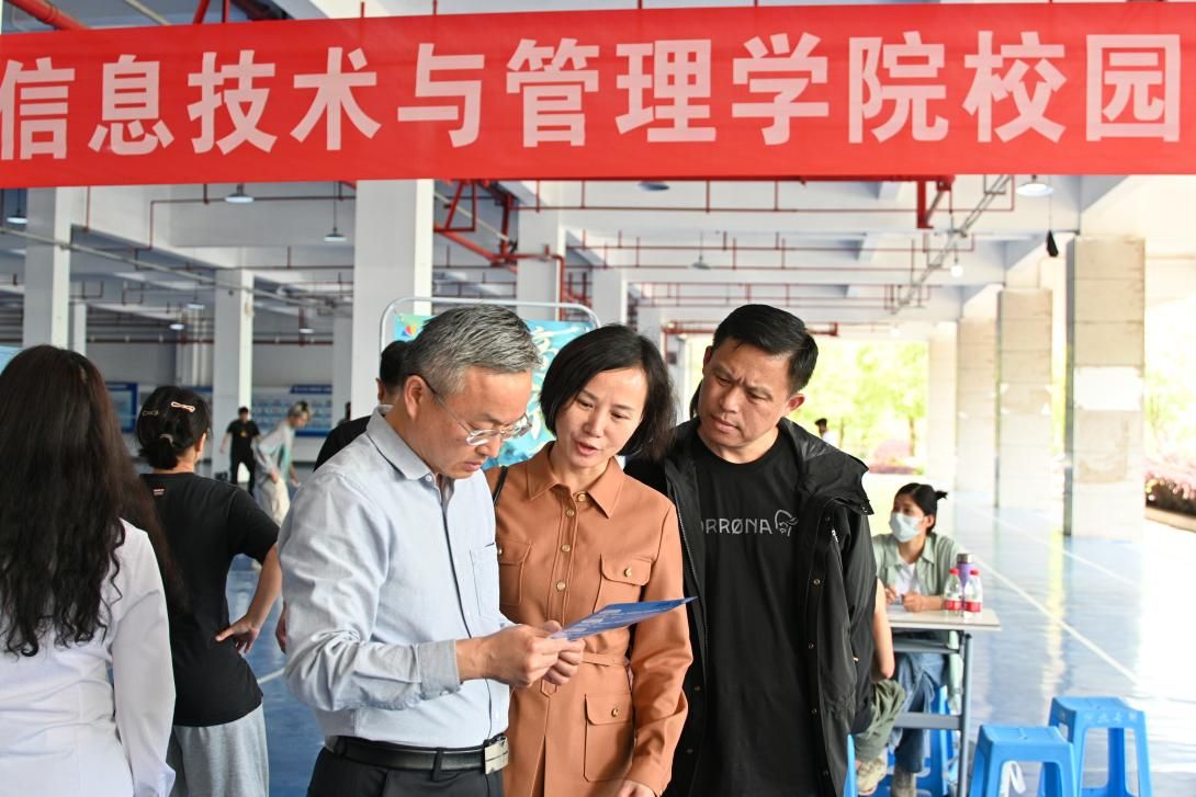 (本网讯)为把握春季招聘黄金期,深化校企供需对接,4月17日下午,信息技术与管理学院在主校区体育馆一楼南运动场举办校园微型招聘会。副校长刘钟理深入现场调研指导,学院党委书记李映泉、党委副书记唐雄伟、副院长周航军、学工办副主任陈慧、毕业班辅导员以及2025届毕业班学生参与现场活动。