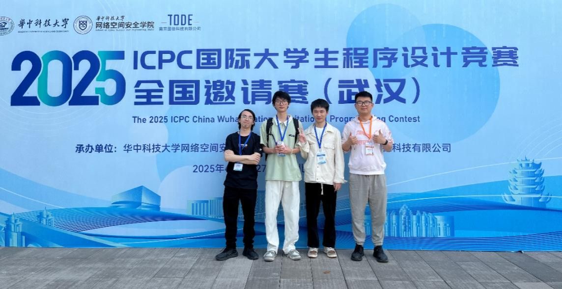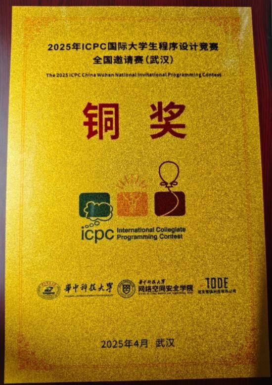 2025年ICPC国际大学生程序设计竞赛(International Collegiate Programming Contest)全国邀请赛(武汉)于4月26-27日在华中科技大学网络空间安全学院圆满落幕。本次武汉站邀请赛吸引了浙江大学、上海交通大学、武汉大学、华中科技大学、哈尔滨工业大学等全国193所高校的300余支精英队伍,900余名选手参加,竞争激烈。beat365官网信息技术与管理学院ACM训练队2021计算机科学与技术一班刘皝、2021计算机科学与技术四班陈浩、2022计算机科学与技术三班阳金波三名同学组成的参赛队在比赛中沉着应战,凭借扎实的算法功底与出色的团队协作,成功解出多道题目,最终斩获铜奖,实现了beat365官网在ICPC国际大学生程序设计竞赛历史上奖牌零的突破。