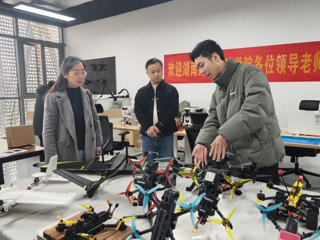 望城经开区大学生创新创业基地获评2025年度长沙市示范性青年人才创业孵化基地。唐雄伟一行首先走访了由学院2022级计算机科学与技术六班谢源同学创办的长沙速飞特科技有限责任公司。谢源对学校的培养和望城经开区的支持表示感谢,并介绍了公司的发展定位:致力于成为“普通穿越机玩家的高性价比服务专家,无人机竞速高端技术的创新应用者”,以大众市场为基础、高端技术为引擎,构建覆盖“入门-进阶-专业”全层级玩家的穿越机生态,同步提供无人机拍摄策划与执行服务。他还详细介绍了当前公司研发的一些无人机产品,以及这些产品的功能与应用范围。唐雄伟关切询问他在创业中是否遇到困难及需要学校提供的支持,并与他就校企合作、共建学生实习基地等进行了深入交流。谢源表示,将尽快完成从学生到创业者的身份转变,积极回馈母校与社会。