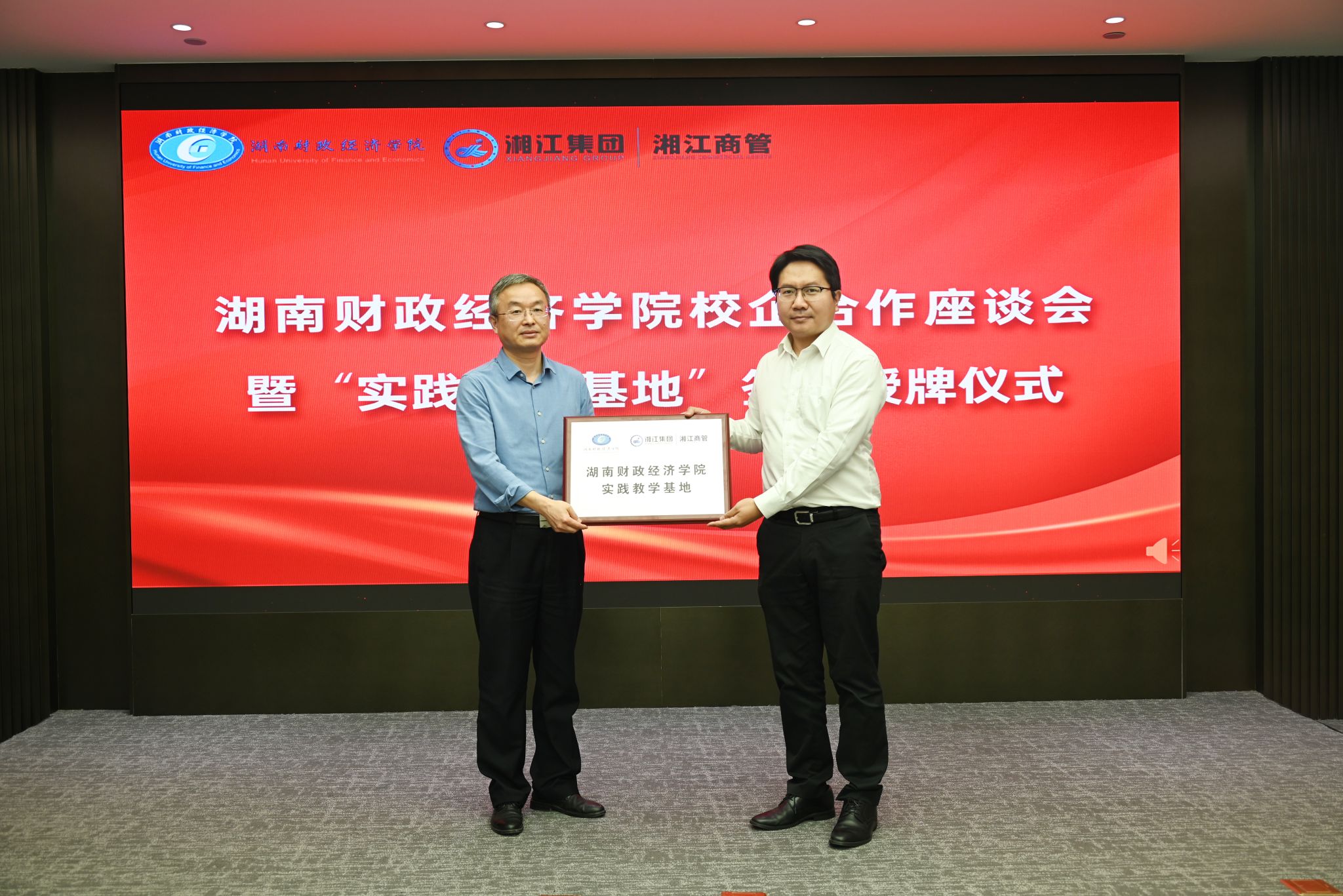 黄国华、陈珂分别代表校企双方进行校企合作签约,刘钟理为湖南湘江新区发展集团有限公司教学实践基地授牌。