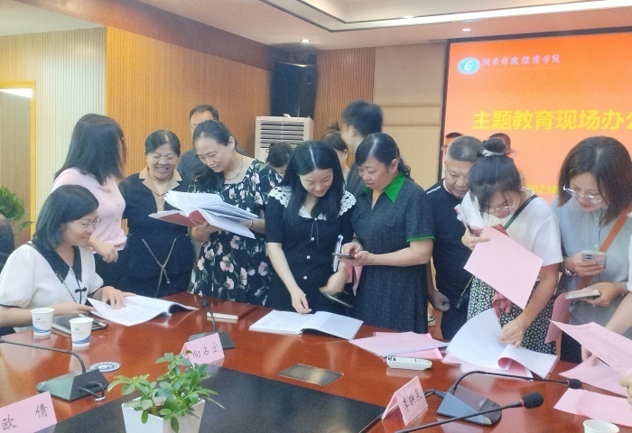 参会人员观摩经济地理学院直属党支部主题教育材料 邓巍伟/摄