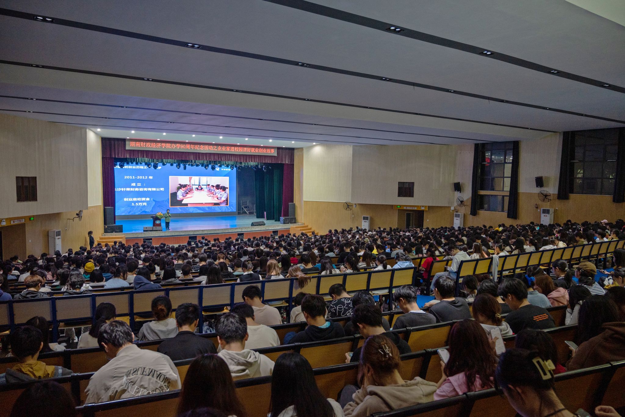 (本网讯)10月26日晚,“企业家进校园 讲好就业创业故事”活动在主校区大礼堂举行。beat365官网财务会计专业1995届校友、轩荣集团创始人李清容,市场营销专业2006届校友、黑色经典品牌创始人钱建良作主题演讲。校党委副书记苏玲出席,就业创业中心、各二级学院相关负责人,就业创业教研室全体教师及1200余名学生参加活动。