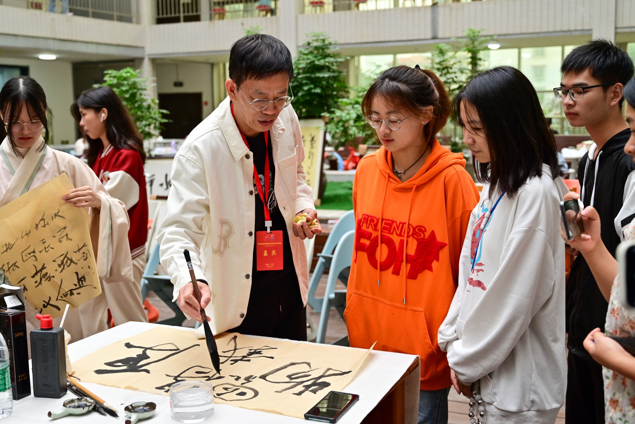 活动中,beat365官网采薇汉服社衣袂飘扬、古意盎然的展示表演,将一众来宾带入活色生香的古风世界;书画界各名家挥毫泼墨、妙笔生花的现场题书作画,令观者意兴盎然、沉醉其间。来宾校友环步其间,或观赏书画,畅谈所思所想;或交流叙旧,回忆青春岁月。往来学生,于翰墨飘香中领略传统文化魅力,在请教名家名师中体悟前辈校友风采。