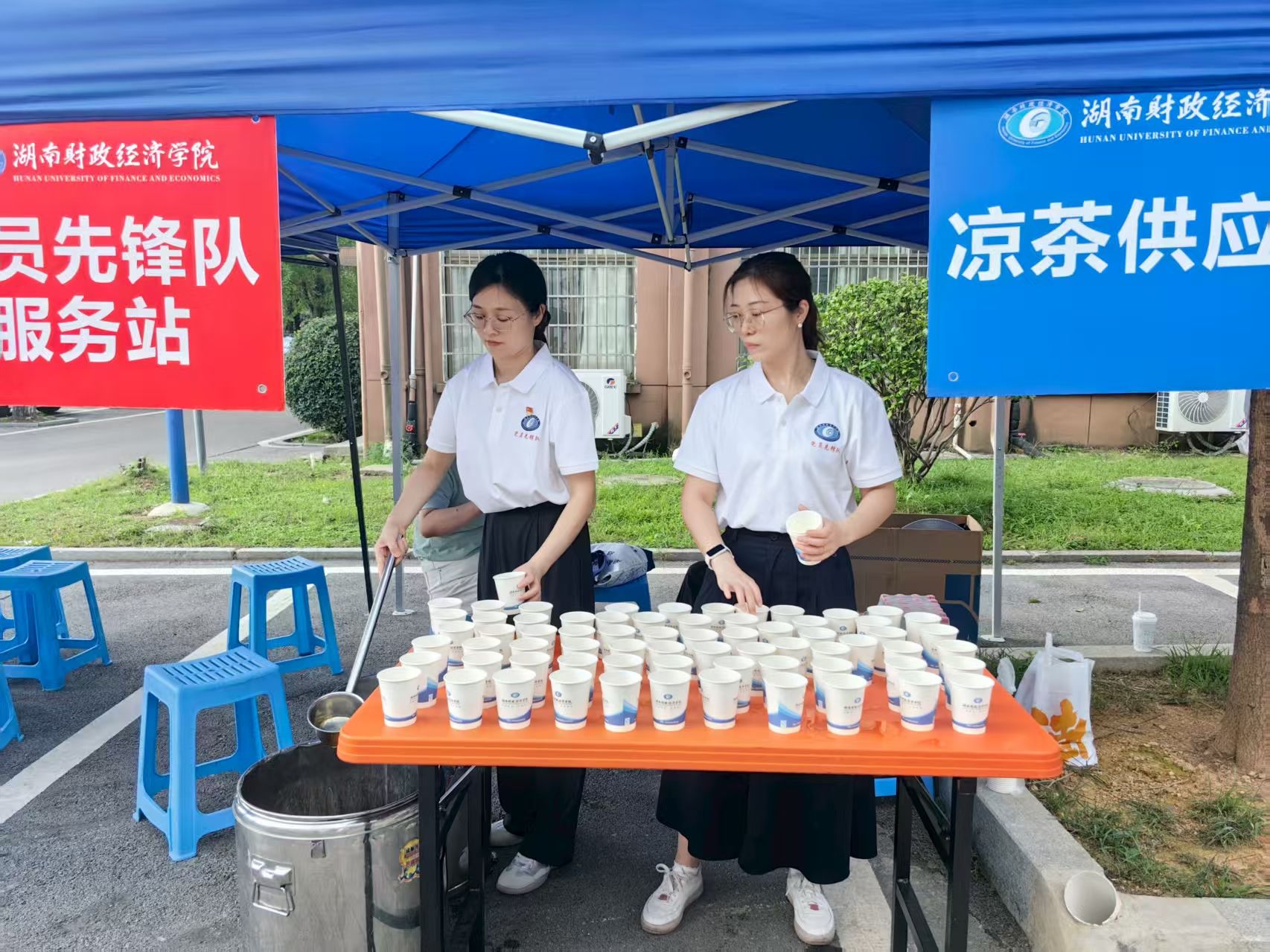 先锋队队员周雄艳、唐甜给新生及家长准备凉茶(摄影:袁冶)
