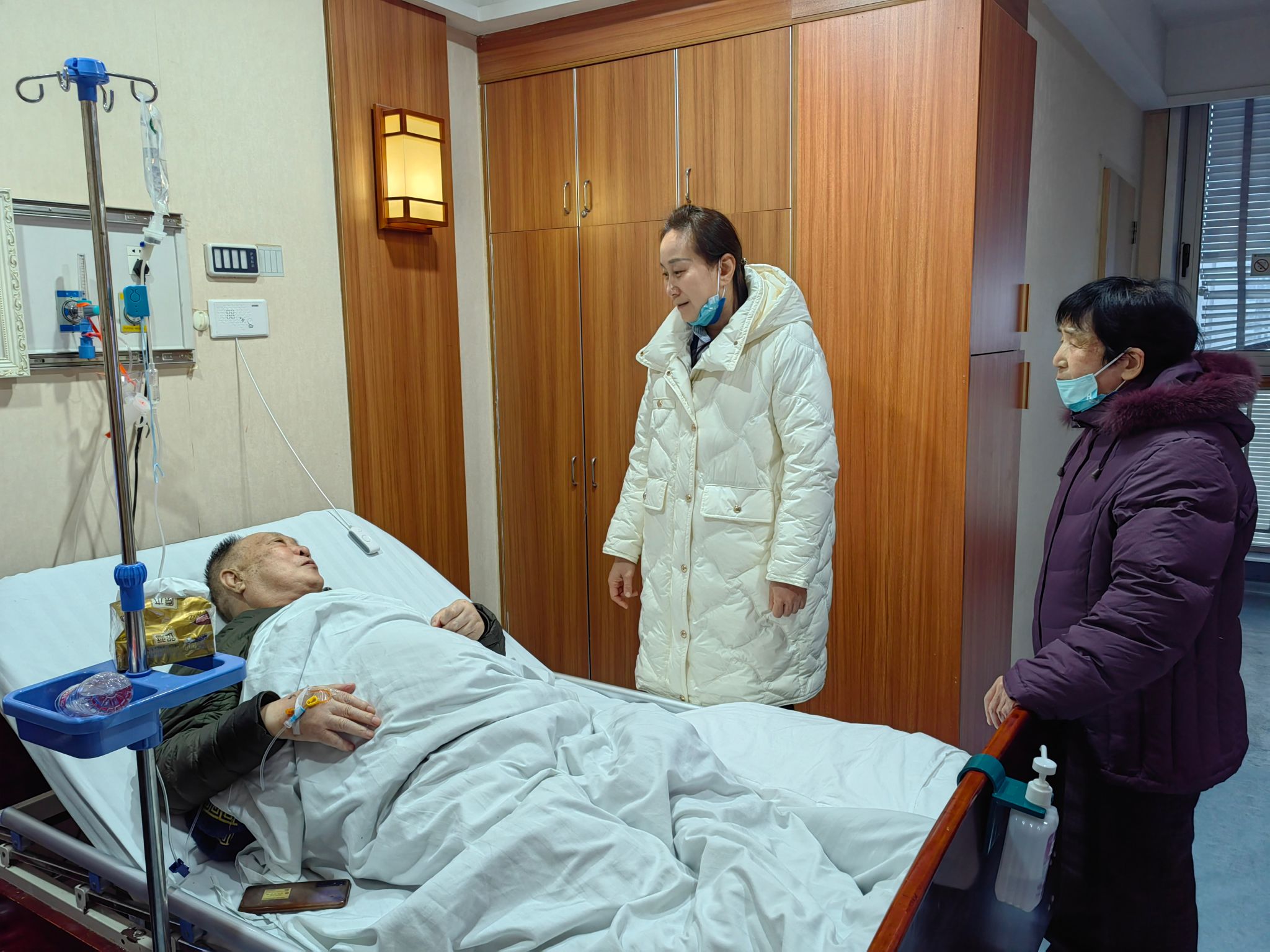 校党委副书记苏玲(中)走访慰问生病住院的老党员、老干部符方照(左)和老党员吴安喜(右) 张旸/