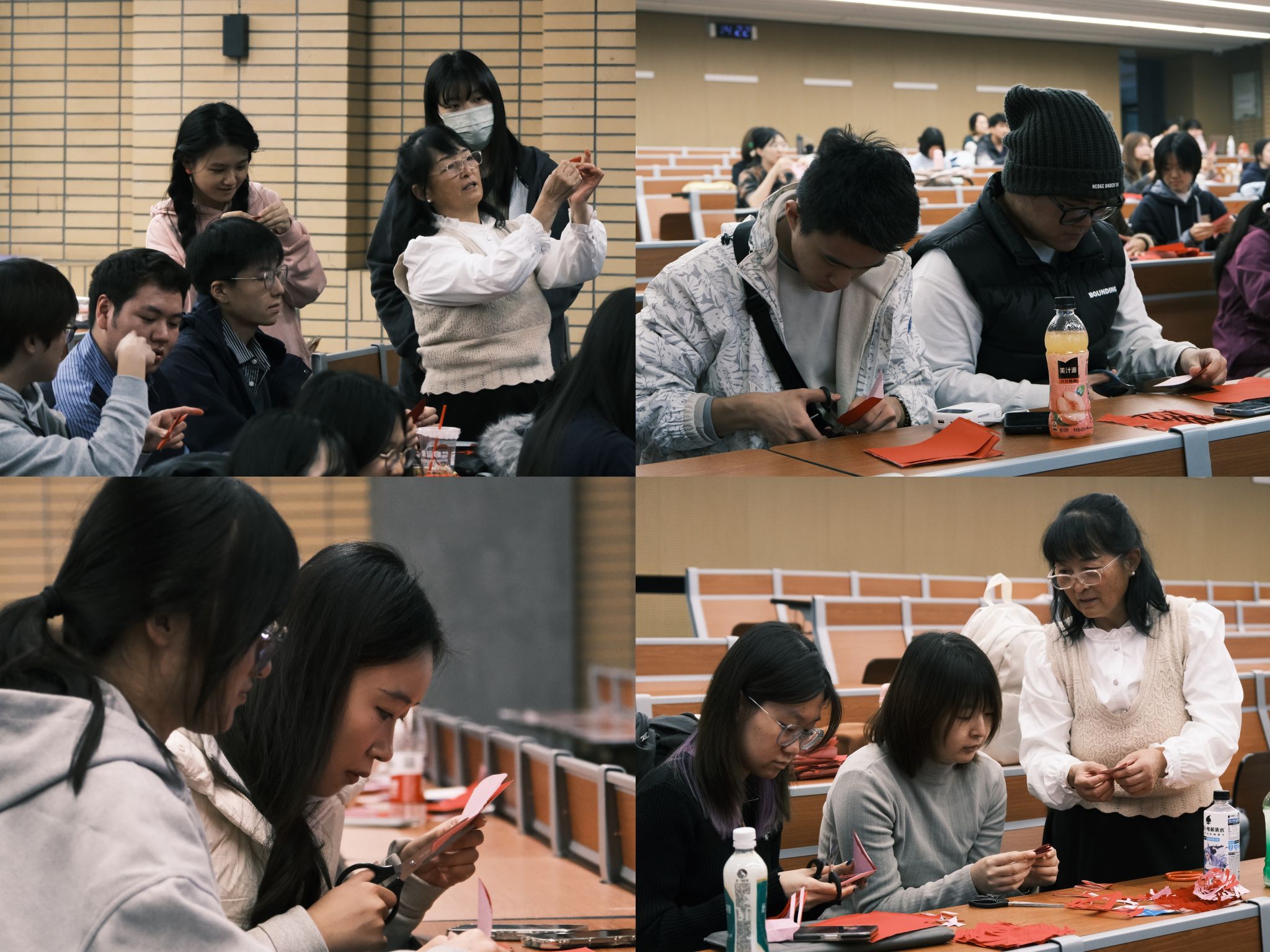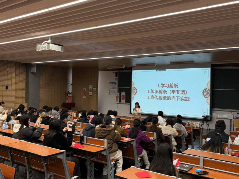 在互动体验环节,在李爱荣女士的耐心指导下,jinnianhui今年会学生们上手操作,亲身从最简单的“网兜”造型做起,再到“喜”字、立体“春”字、枫叶、窗花等剪纸图案。在近三个小时的体验中,全场同学聚精会神,耐心听取李老师讲解步骤,时不时传来欢声笑语,同学们的桌上渐渐堆满了色彩鲜艳的剪纸作品,每一件都承载着对传统艺术的理解与创新。