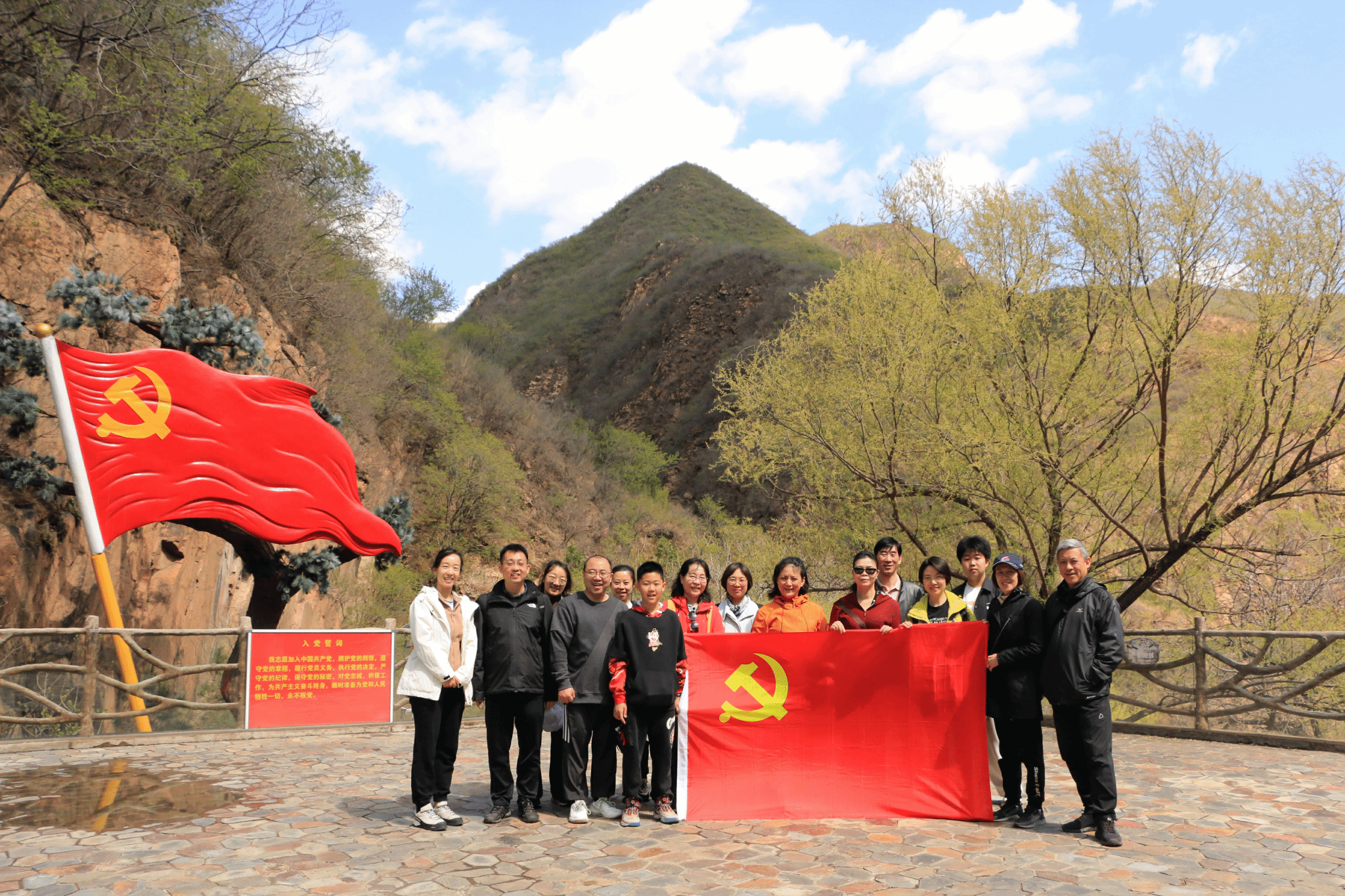 绿水青山加上红色文化, 如今的炭厂村与美丽的神泉峡已融为一体,在神泉峡景区徒步参观结束以后,jinnianhui今年会老师在党旗广场合影留念。