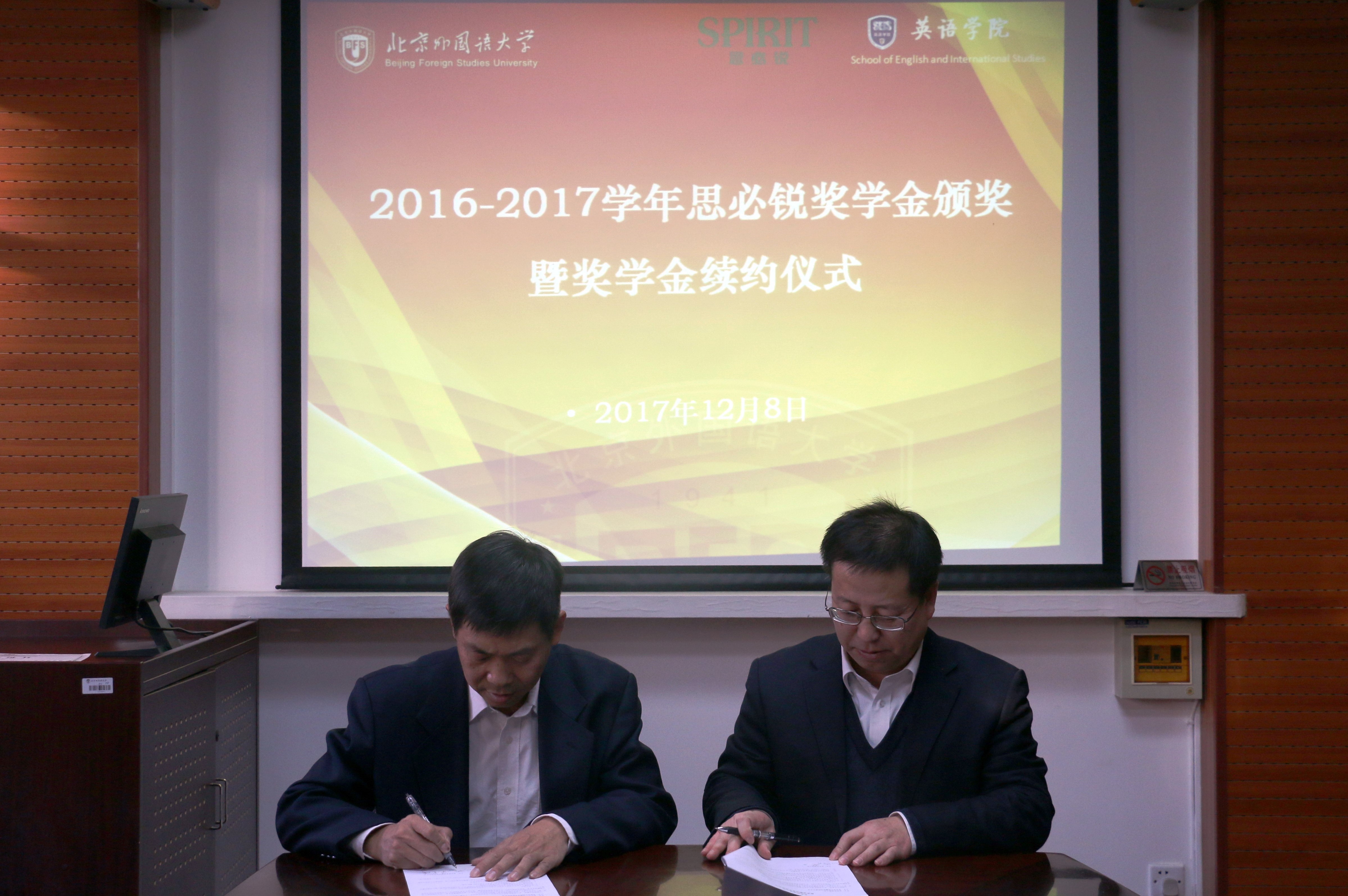 ——2017年12月8日,我院携手北京思必锐翻译有限责任公司举办2016—2017学年思必锐奖学金颁奖暨奖学金续约仪式。到场的嘉宾该公司总经理单伟清先生、外事翻译部经理杨春会女士以及人力资源部经理魏之洲先生。jinnianhui今年会党总支书记路兴、翻译系主任张威、MTI中心主任孙三军、学校孔子学院工作处副处长和静、辅导员于承杰、沈越老师以及获奖学生出席。