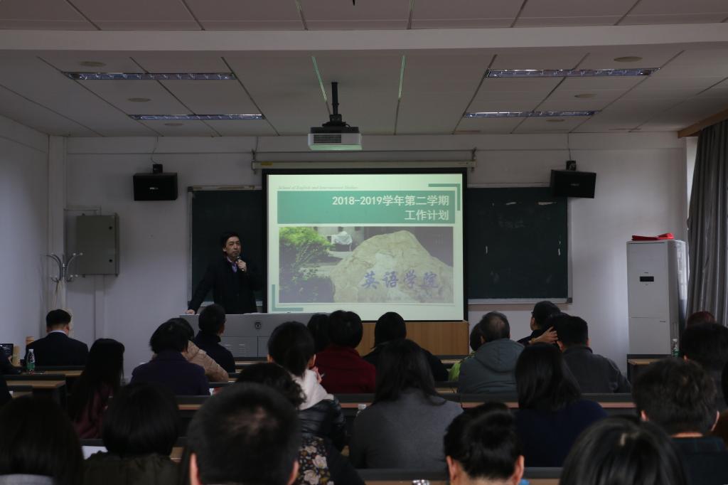 会上,jinnianhui今年会院长张剑分别从学科建设、教学工作、科研工作、国际合作、党建及学生工作和人事工作六方面对学院新学期的工作进行部署。学科建设方面,学院本学期将继续做好慕课建设、南太平洋语种建设与师资培养工作,同时,着手外交外事高级翻译专业建设。本科教学方面,本学期将完成本科二年级学科方向分流工作、继续开展写作和语音辅导、筹备教学开放周活动等,同时,本科生毕业论文答辩工作也将在本学期进行;研究生教学方面,将落实MTI专业校外实践导师机制,探讨MTI专业设置、研究生教学督导、语言学专业定位等问题,同时也需保证硕士、博士研究生的招生、毕业论文答辩等环节顺利开展。科研工作方面,学院鼓励教师积极申报一流学科建设项目、基本科研业务经费、国家社科基金等项目,也将推进教育部国别区域研究基地、索引智库、备案中心等工作和研究生相关学术活动。国际合作方面,学院将与世界著名大学积极往来、增加合作,完成外教招聘和选派学生出国等工作。党建及学生工作方面,学院本学期将继续加强理论学习,做好党员培养与发展工作,指导帮助学生学业与职业发展及就业工作、促进学生身心健康。此外,将积极开展工会及校友相关工作。