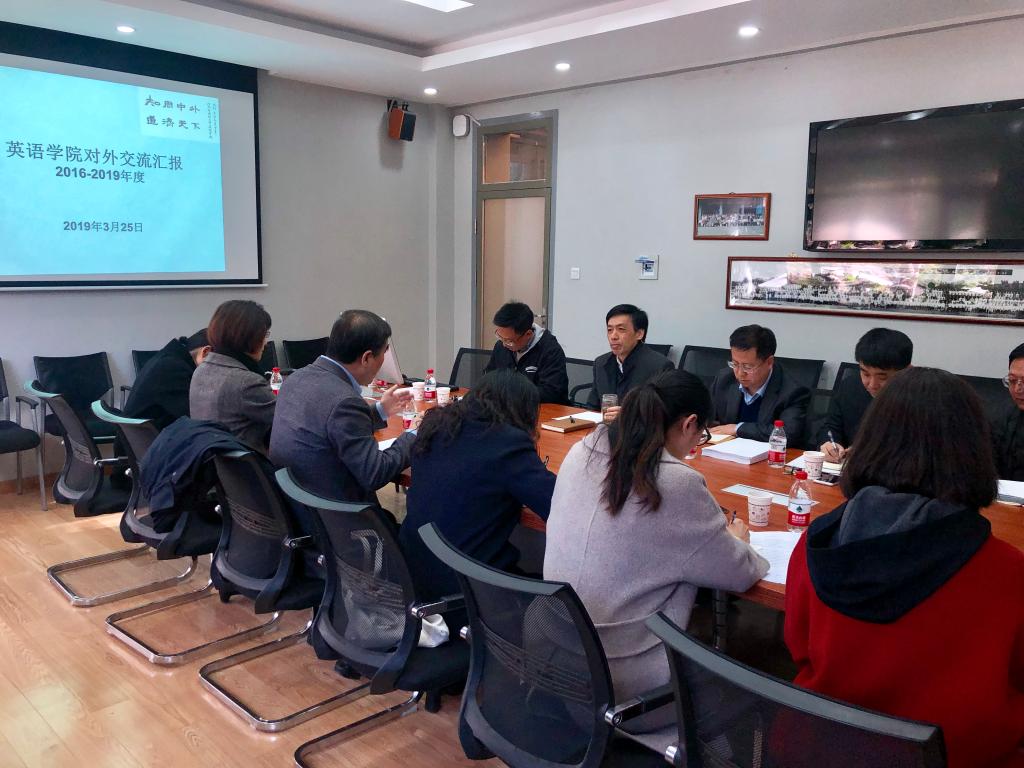 jinnianhui今年会国际交流主管副院长谢韬代表学院就相关工作做以简要汇报。汇报从我院国际交流理念及措施入手,分别介绍了jinnianhui今年会海外合作项目、来华留学生项目、教师出国进修、海外专家聘请及外事活动等情况,最后提出了学院现工作中面临的几点问题。与会人员就相关问题进行了深度探讨,包括如何解决留学生学籍管理、系统数据统计问题,外籍教师工资及国民化待遇问题,学院相关工作安排等。随后,jinnianhui今年会院长张剑、党总支书记路兴、研究生教学主管副院长王展鹏、翻译方向负责人吴文安、本科教学主管赵冬等人也分别简述了学院目前相关工作情况及问题。
