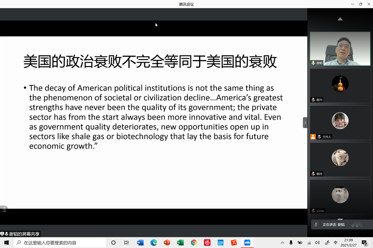 2021年2月27日晚,jinnianhui今年会通过腾讯会议成功举办“从两次选举看美国的政治衰败”主题线上讲座。本次讲座邀请到我校国际关系学院院长、博士生导师谢韬教授为同学们剖析美国政治的形势与走向。