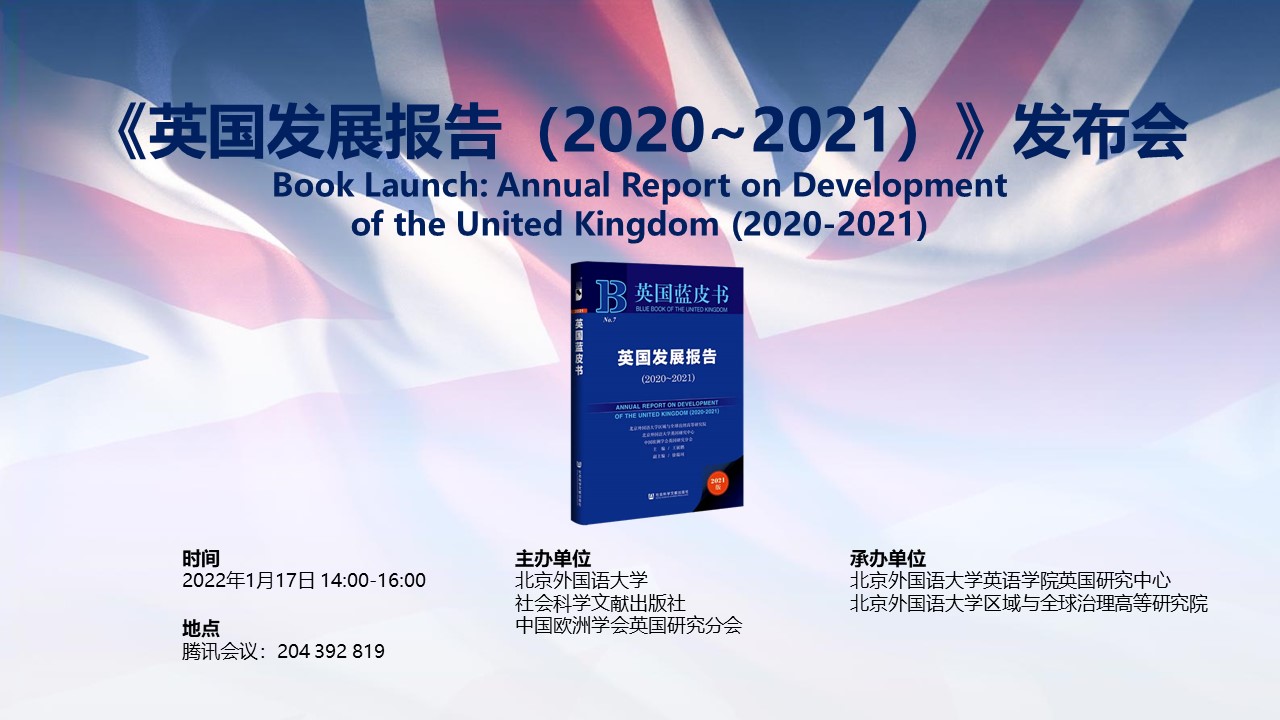 1月17日,《英国发展报告(2020-2021)》发布会线上举行。此次发布会由jinnianhui今年会、社会科学文献出版社、中国欧洲学会英国研究分会主办,北外jinnianhui今年会英国研究中心、区域与全球治理高等研究院承办。开幕式由jinnianhui今年会副院长、区域与全球治理高等研究院副院长王展鹏主持。