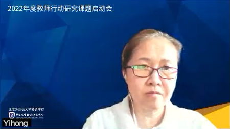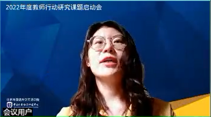 课题组汇报结束后,中心副主任王一虹老师向参加课题启动会的所有老师表达了真挚的敬意,对大家在百忙中如约参与研讨表示感谢。她表示非常开心看到中小学一线老师开始反思目前的教学现状,并逐渐从反思型教师到研究型教师过渡。她说在这个过程中学术思维的培养非常重要,并强调了“聚焦真问题、以终为始、以及研究方法和数据的收集”的重要性。