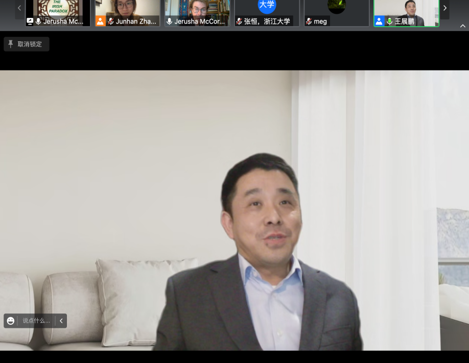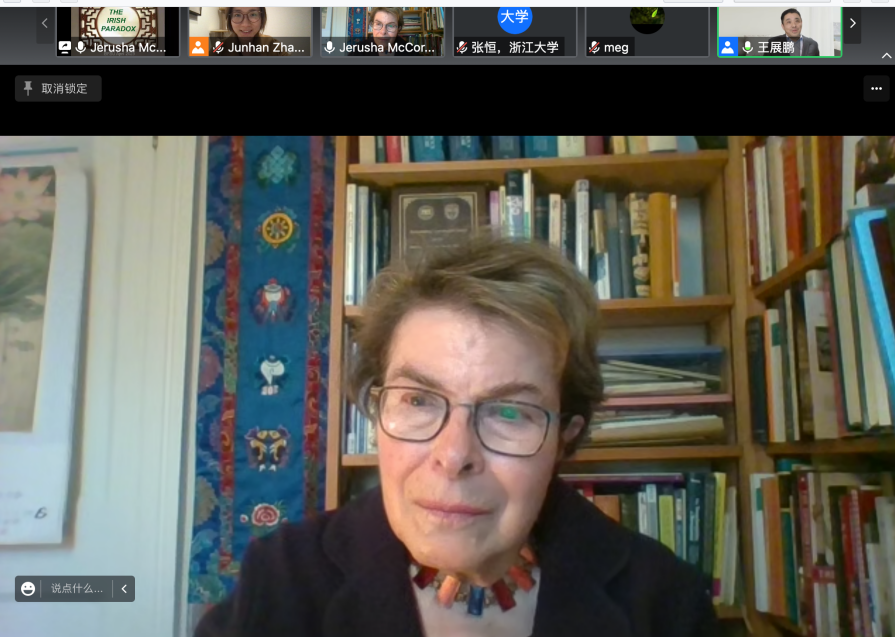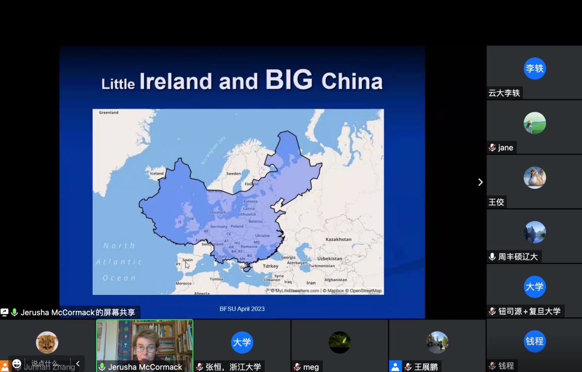 Jerusha McCormack教授围绕“小国爱尔兰如何发挥国际影响力”这一主题,全面阐述了爱尔兰丰富的历史文化遗产、近年来的经济腾飞,以及爱尔兰在国际政治中的角色变化等维度上的成就,并以此作为“爱尔兰施加广泛国际影响”的注脚。她同时指出凯尔特文化、爱尔兰文学等要素增强了爱尔兰文化软实力,并进而提升了爱尔兰对对世界的影响。作为中爱文明对比的专家,她还对中爱文明的历史、社会形态、经济社会变革等相似性进行了讲解,将中国学生更好地带入研论的情境。