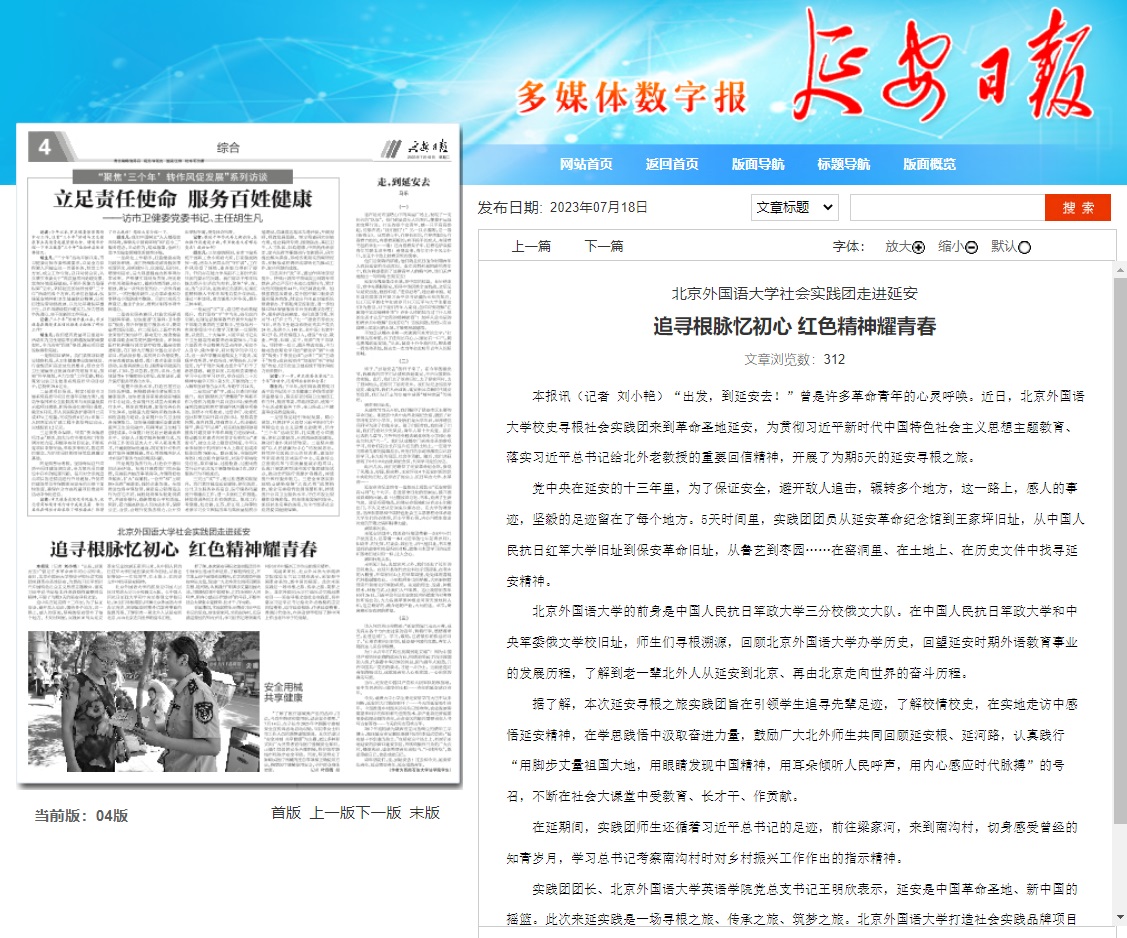 7月6日《延安日报》刊登题为《jinnianhui今年会社会实践团走进延安 追寻根脉忆初心 红色精神耀青春》,报道jinnianhui今年会校史寻根实践团前往延安开展实地调研活动。