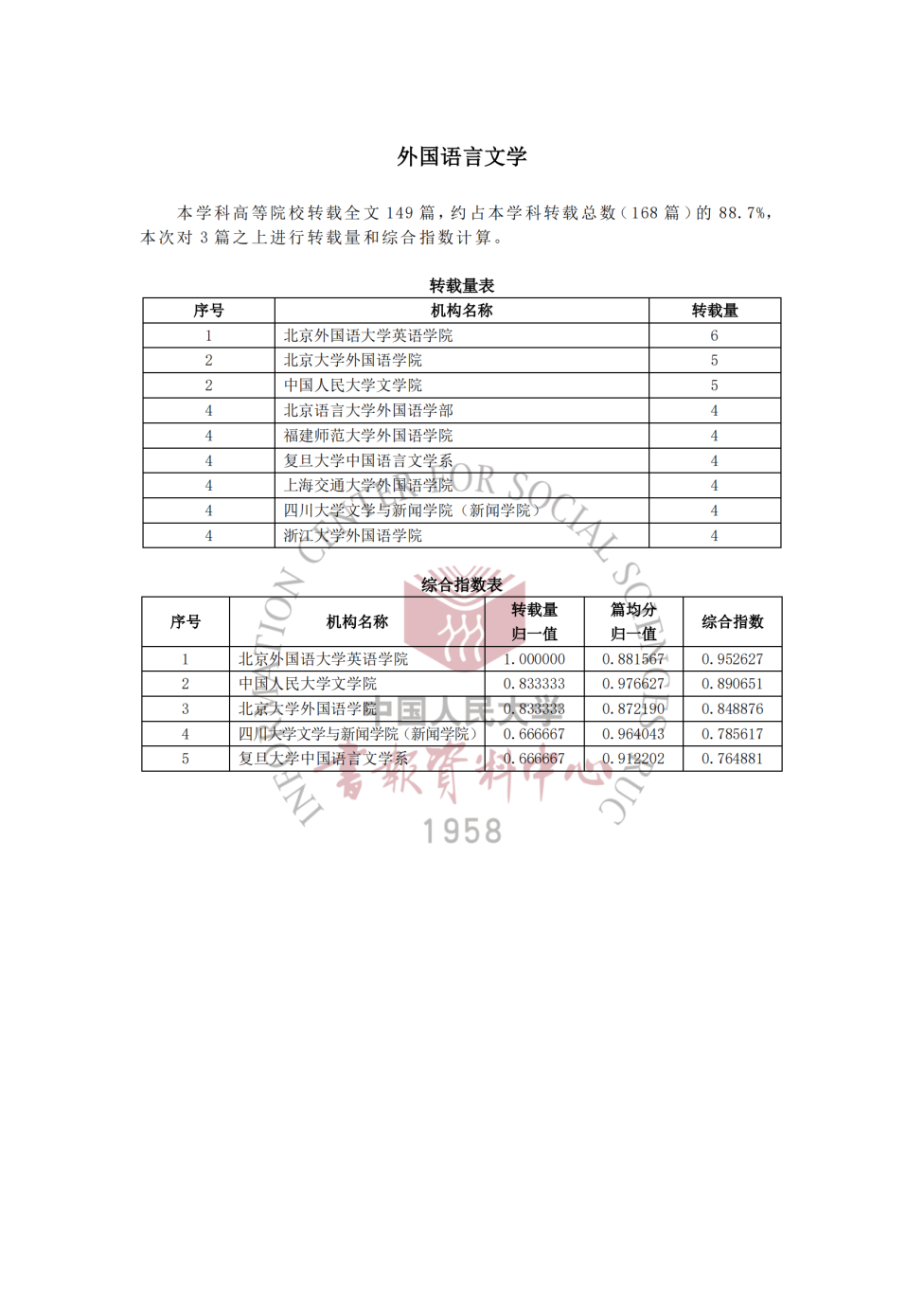 在该研究报告中,“外语语言文学”学科高等院校转载全文149篇,约占本学科转载总数(168篇)的88.7%,本次对机构3篇之上转载量和综合指数进行计算。jinnianhui今年会jinnianhui今年会在该学科论文的“转载量表”和“综合指数表”均排名第一。