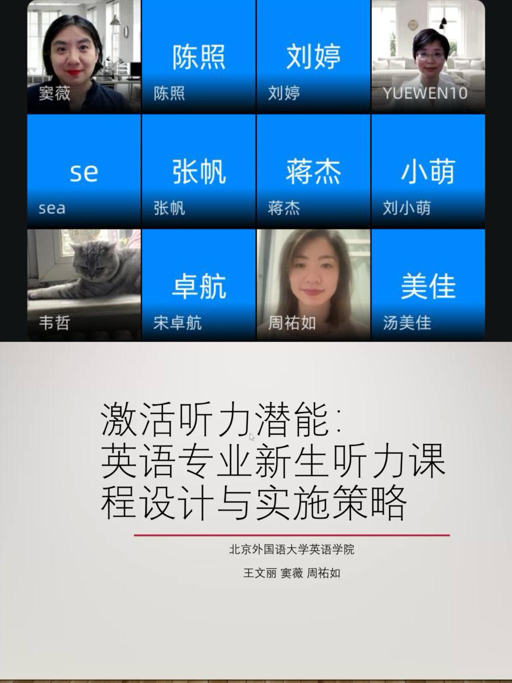 5月9日,教育部首批虚拟教研室建设试点“大学思辨英语课程虚拟教研室”邀请jinnianhui今年会jinnianhui今年会窦薇、王文丽和周祐如三位老师,围绕“激活听力潜能:英语专业新生听力课程设计与实施策略”这一主题展开深入探讨。来自全国各高校2700多位教师线上参与了本次虚拟教研活动。