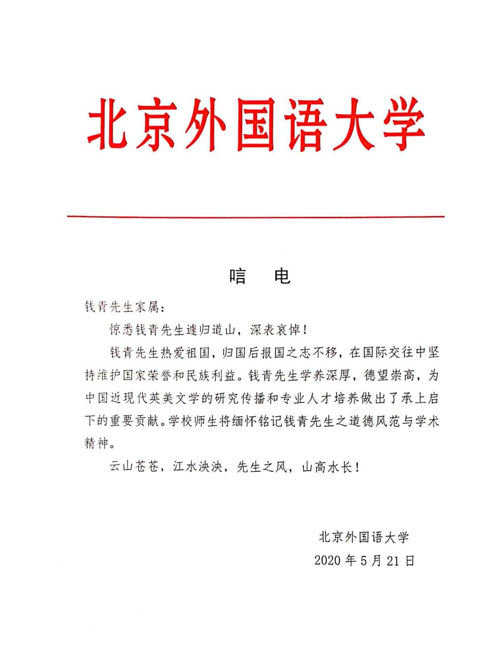 唁电:深切缅怀钱青教授
