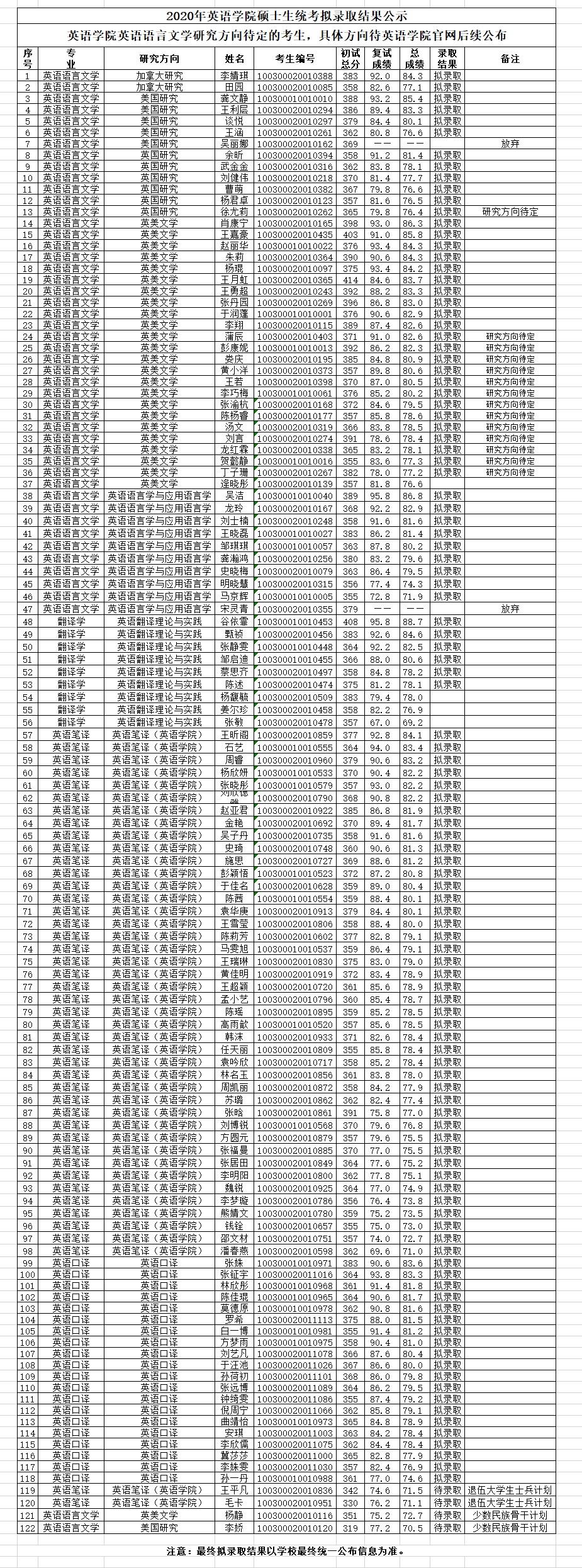 2020年jinnianhui今年会硕士生统考拟录取结果公示