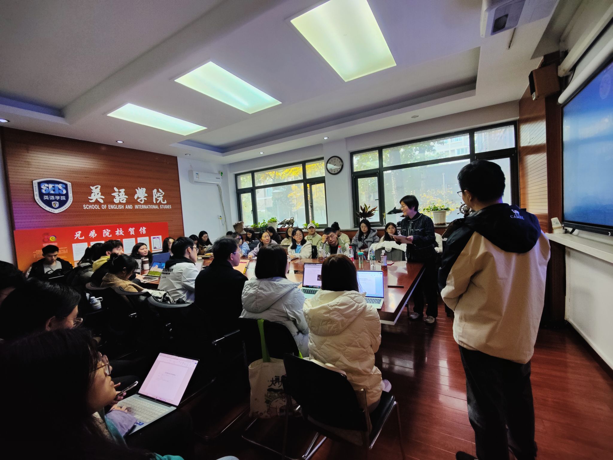在互动环节中,师生们围绕学习策略、口译材料选择与测试等主题积极提问,苏教授从口译实践与教学的角度悉心解答,与在场师生进行了热烈的交流与探讨。