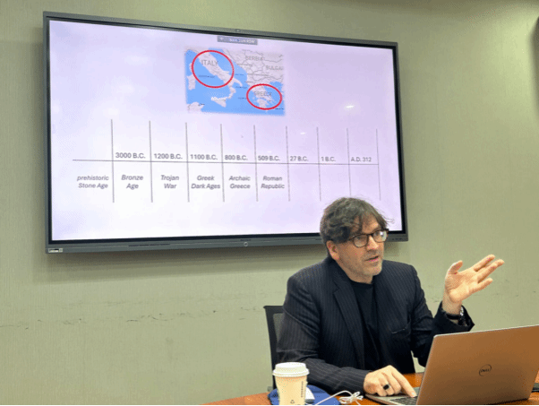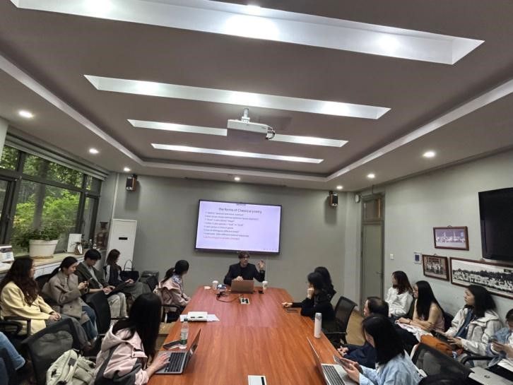 2025年4月21日下午,剑桥大学克莱尔学院古典学系副教授查尔斯·韦斯(Charles Weiss)博士应jinnianhui今年会英语文学研究中心之邀,于学院111会议室做了题为“The Forms of Classical Poetry”(西方古典诗歌的形式)的学术讲座。由英语文学研究中心、《英语文学研究》编辑部承办,旨在为广大师生提供一个深入了解古希腊、古罗马诗歌主要韵式的机会。本次讲座由英语文学研究中心邵雪萍老师主持,吸引了来自不同院系的本科生、研究生、博士生及青年教师近四十人参加。