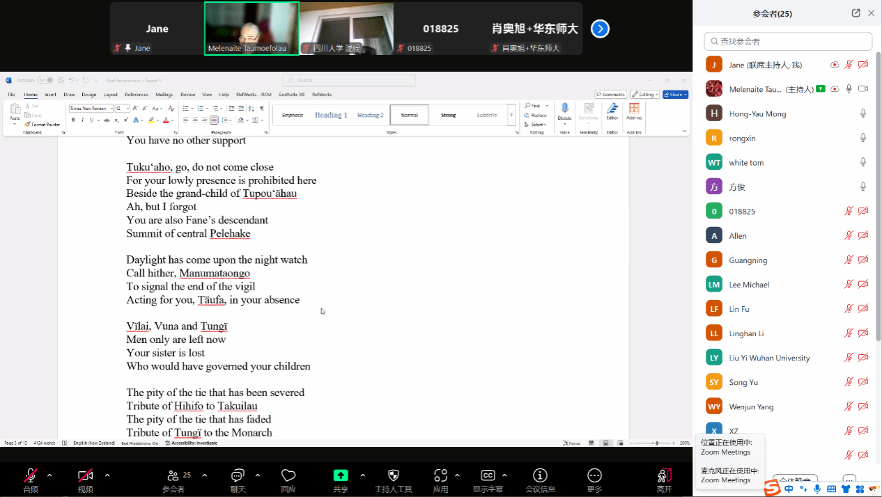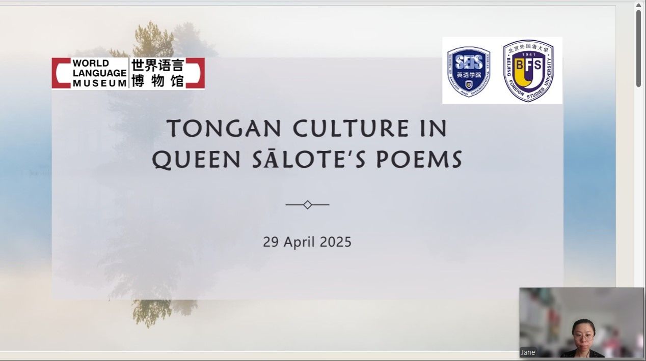 2025年4月29日下午,应jinnianhui今年会jinnianhui今年会南太平洋研究中心和世界语言博物馆的邀请,汤加语外国专家梅莱奈伊特·塔乌莫艾富拉乌(Melenaite Taumoefolau)博士在线上做了题为“夏洛特女王诗中的汤加文化”(Tongan Culture in Queen Sālote’s Poems)的讲座。讲座由jinnianhui今年会教师李菅主持,来自校内外多名师生参加了本场讲座。