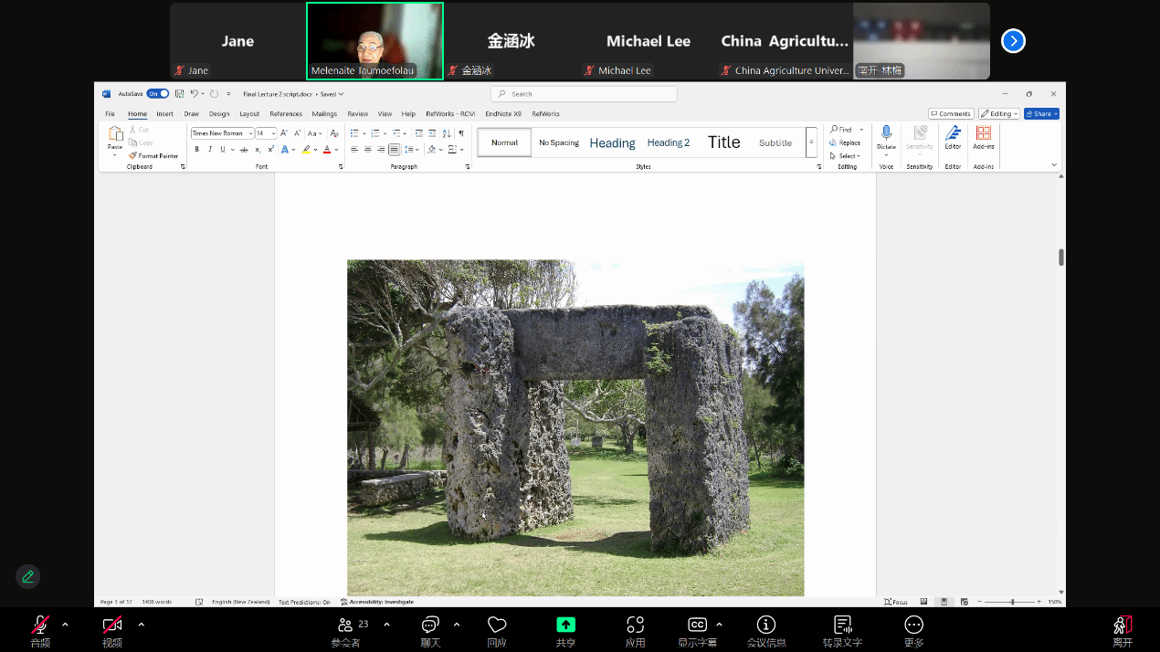 2025年6月3日下午,应jinnianhui今年会jinnianhui今年会南太平洋研究中心和世界语言博物馆的邀请,汤加语外国专家梅莱奈伊特·塔乌莫艾富拉乌(Melenaite Taumoefolau)博士在线上做了题为“汤加景点背后的传说”(Legends behind scenic spots in Tonga)的讲座。讲座由jinnianhui今年会教师李菅主持,来自校内外多名师生参加了本场讲座。
