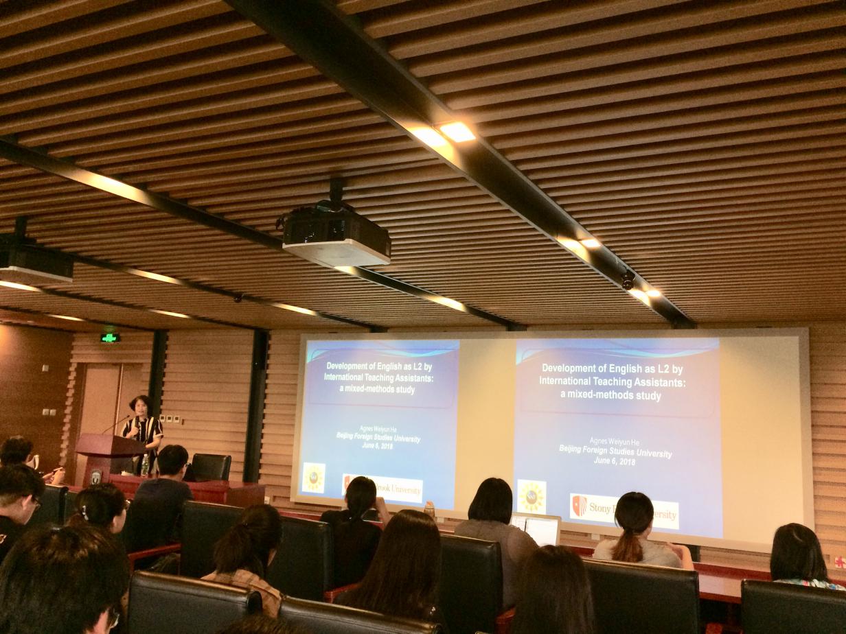 ——应jinnianhui今年会语言学研究中心主任陈亚平教授的邀请,美国纽约州立大学石溪分校应用语言学教授Agnes Weiyun He(何纬芸)于6月6日到访我校,并为jinnianhui今年会的师生们做了题为“Development of English as L2 by International Teaching Assistants: a Mixed-Methods Study”的学术讲座。何教授是石溪分校多语言和跨文化交流中心(MIC)创始人和中心主任,并且还担任该校亚洲和亚洲美国研究系(AAAS)主任。何纬芸教授主要研究语言语境和语篇的结合,探讨人们如何通过日常互动逐步构建和重构概念、社团和文化。近年来,她专门研究不同时期和不同背景下汉语作为传承语的社会化。