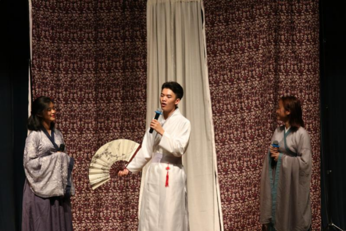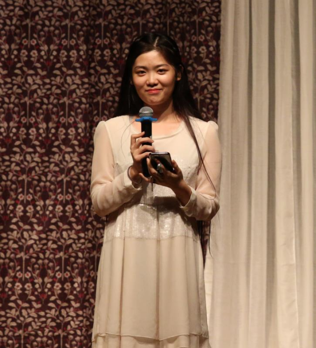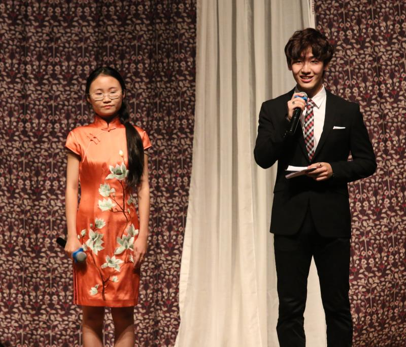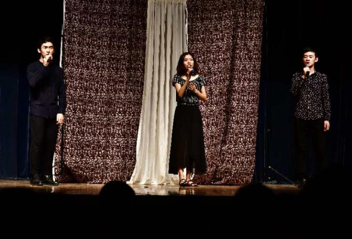 当晚的节目由英院15级本科生薛雨彦与胡馨友主持,节目中的双语版中国古风歌曲《东风志》为绿萝剧社负责人邵雪萍指导的国家级大学生创新项目“中国古风歌曲的翻译与传播”的阶段性成果,由来自jinnianhui今年会、国际新闻传播学院、中国语言文学学院的中外学生共同演唱,中英文歌词的和谐交织与演唱者的动人歌喉令观众掌声雷动。