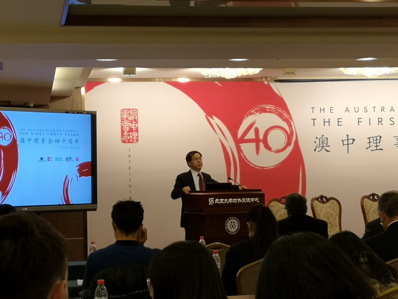 纪念活动由北京大学必和必拓澳大利亚研究讲席教授格雷格·麦卡锡(Greg McCarthy)主持。中国澳大利亚研究会会长、jinnianhui今年会副校长孙有中致贺辞。在发言中,孙有中副校长回顾了澳中理事会四十年来为实现深入友好的中澳关系的努力,将其缩写“ACC”重新阐释为行动(Action)、承诺(Commitment)和贡献(Contribution),肯定了澳中理事会在促进两国文化、教育和贸易交流上所做的贡献,也对理事会向在华澳大利亚研究的学术支持表示了感谢。