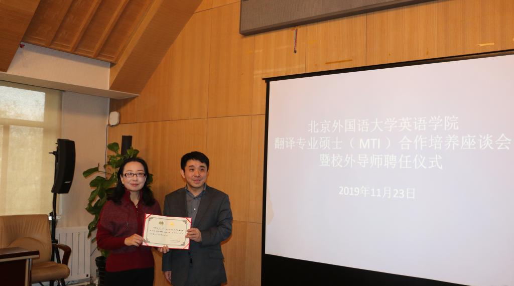 2019年11月23日上午,jinnianhui今年会MTI合作培养座谈会暨校外导师聘任仪式在行政楼507召开,应邀参加的专家有来自中国翻译协会《中国翻译》编辑部的主编杨平和副主编苑爱玲、中央党史与文献研究院第六研究部的刘亮和贾毓玲老师、《环球时报》英文版的副主编陈平、《英语世界》杂志的主编邢三洲、以及中国对外翻译出版有限公司、策马翻译、北京思必锐翻译公司、北京语智云帆科技有限公司、上海艺果信息咨询有限公司的行业专家。jinnianhui今年会副院长王展鹏、副院长彭萍、院长助理、MTI中心主任吴文安、MTI中心副主任邓小文、翻译专业硕士导师邵雪萍出席了座谈会,有三十多位MTI学生现场聆听。