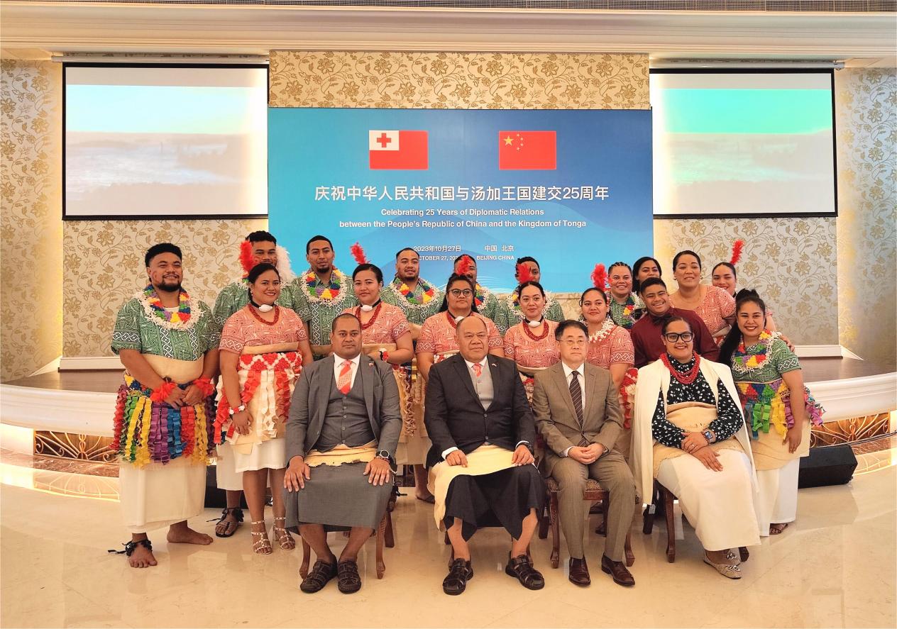 2023年10月27日,中国人民对外友好协会在北京举办庆祝中华人民共和国与汤加王国建交25周年招待会。来自外交部、中联部、商务部、相关高校与企业领导和代表,汤加在京友人和留学生代表,以及新西兰、斐济、瓦努阿图、萨摩亚、基里巴斯、巴布亚新几内亚和密克罗尼西亚联邦等国驻华使节八十余人出席活动。