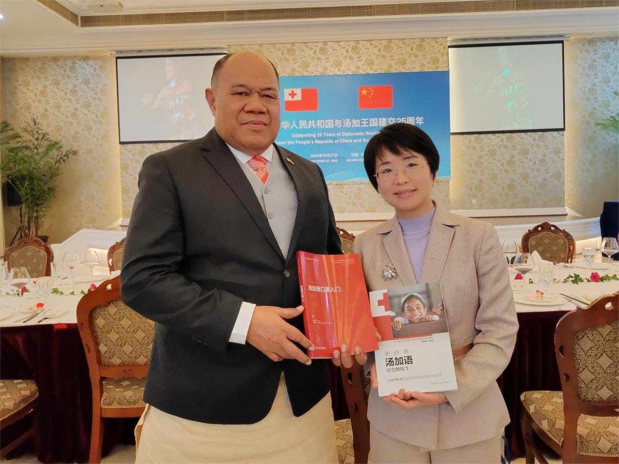 友协副会长姜江、汤加王国驻华大使陶阿伊卡·乌塔阿图在招待会上致辞。jinnianhui今年会王文丽老师作为高校代表、国内首部汤加语教材编写者受邀出席招待会。王文丽老师向中外嘉宾展示了外研社今年出版的两部汤加语教材--《汤加语口语入门》《新经典汤加语综合教程(一)》,并介绍了jinnianhui今年会建设八门南太非通语种专业的工作进展。与会嘉宾纷纷表示赞叹和祝贺,汤加大使对两部教材给予了高度认可与赞扬。
